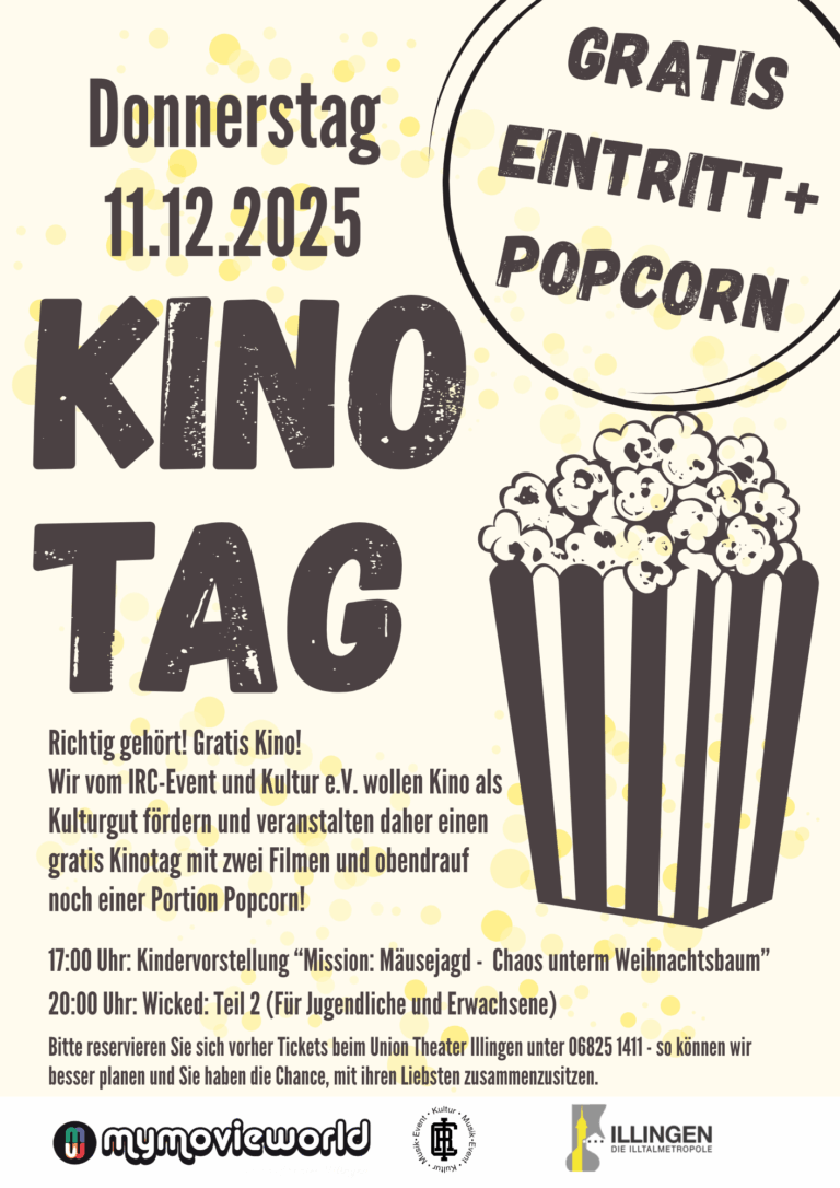 Event Illingen, Familie, Familienkino, Filmvorführung Illingen, Freizeitangebot Saarland, Freude, Freunde, gemeinnützige Kulturarbeit, Gemeinschaftserlebnis Kino, Gratis Kinotag, Illingen Saar, IRC, IRC Event und Kultur e.V., Jugendkino, Kinderfilm, Kinokultur fördern, Kinotag 11.12.2025, Kinoveranstaltung Saarland, kostenloses Kino, Kultur, Kulturveranstaltung, Mission Mäusejagt Chaos unterm Weihnachtsbaum, Popcorn kostenlos, Union Theater Illingen, Wicked Teil 2