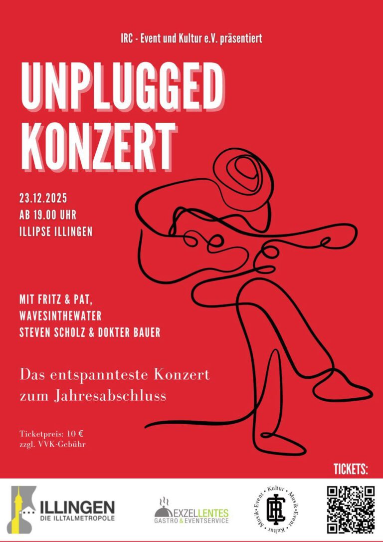 Akustik Konzert Illingen, Dokter Bauer, Fritz & Pat, Ill-Rock-City, Illingen Konzert, Illipse Illingen, IRC, IRC Event und Kultur e.V., IRC-Events, Konzerttickets Illingen, Kulturveranstaltung Illingen, Live Event 23. Dezember, Live Musik Illingen, Musikveranstaltung Illingen, Steven Scholz, Unplugged Abend, Unplugged Konzert 2025, WavesInTheWater, Weihnachtskonzert Illingen